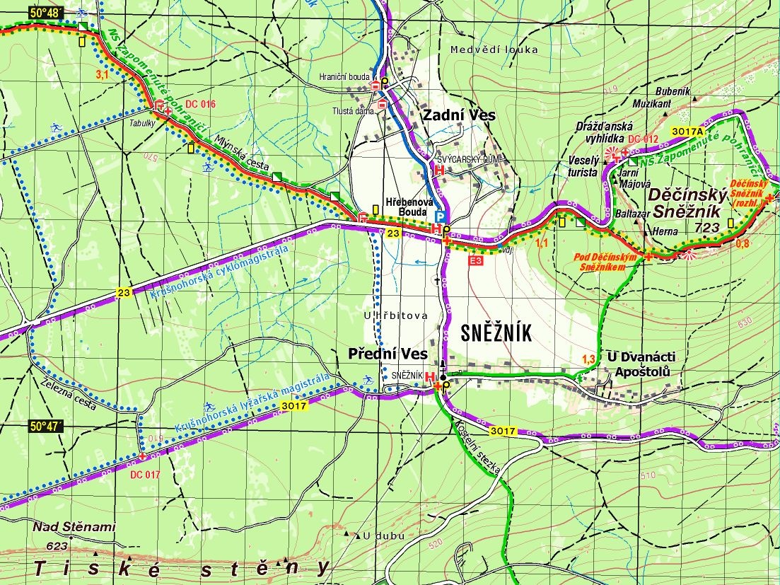 - území od Děčínského Sněžníku včetně německých stolových hor, Národní parky České a Saské Švýcarsko, Lužické hory s návazností na Atlas Jizerské hory a Ještědský hřeben