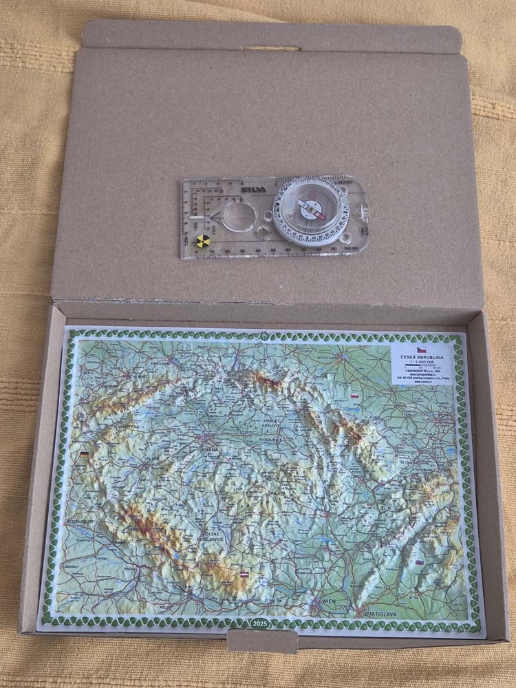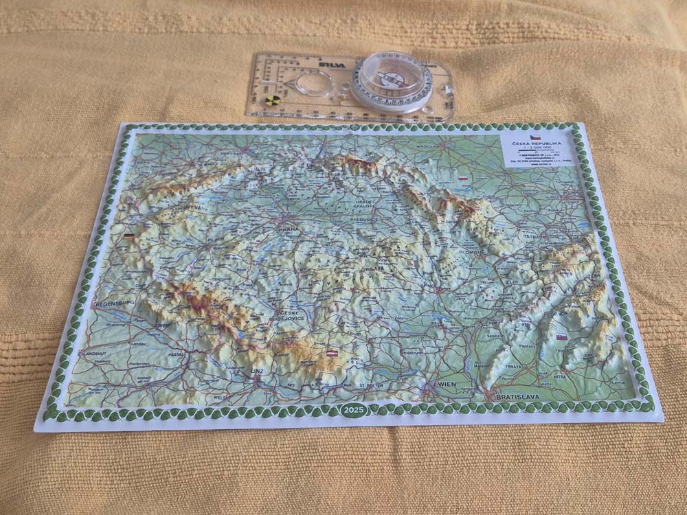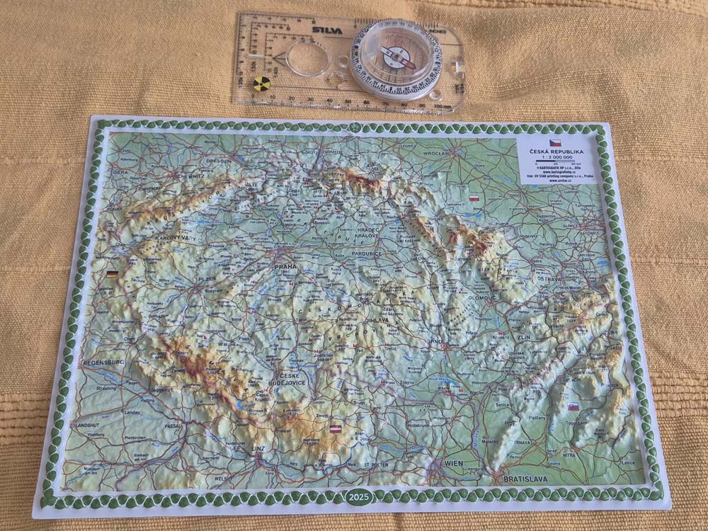 Mapa velikosti 28x20 cm zobrazuje všechny hlavní horské a terénní oblasti, dálniční, silniční a železniční síť, vše ve stavu roku 2025. Dále důležité hrady a zámky.