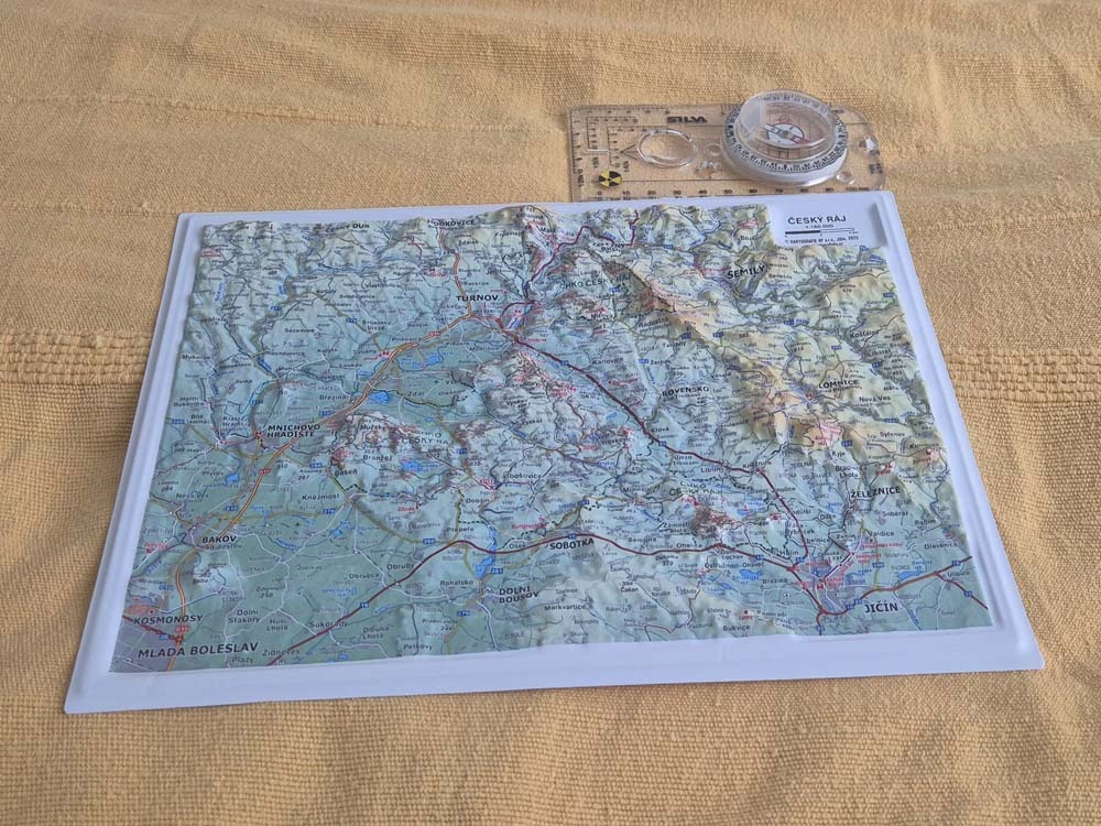 Mapa velikosti 28x20 cm zobrazuje oblast Českého ráje a blízkého okolí, vše ve stavu roku 2025.