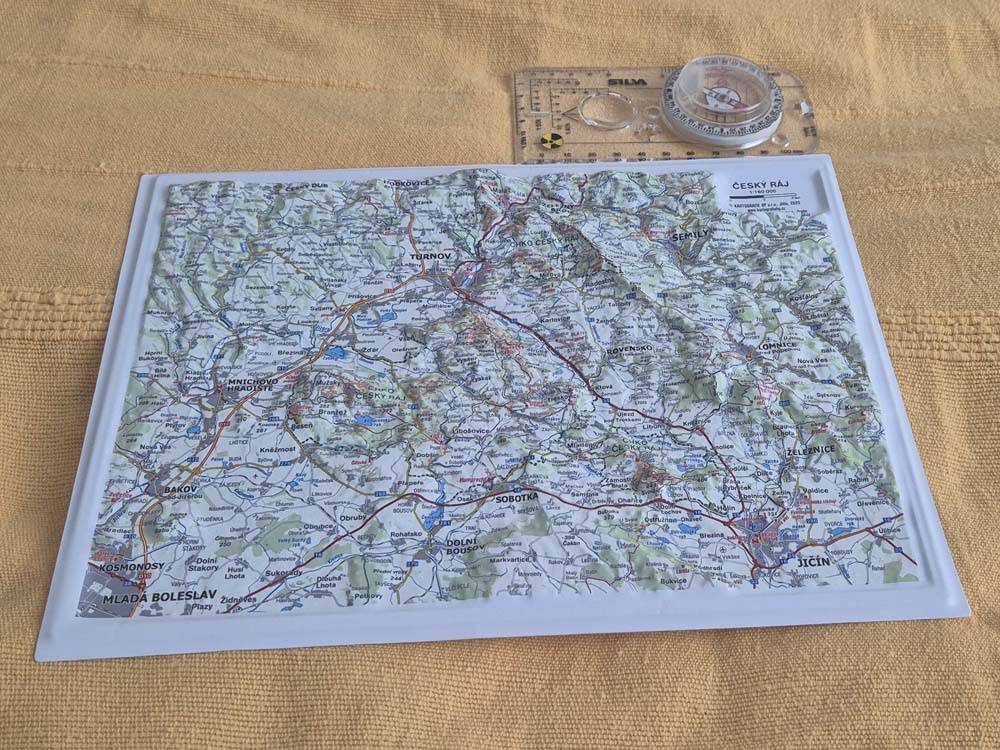 Mapa velikosti 28x20 cm zobrazuje oblast Čského ráje a blízkého okolí, vše ve stavu roku 2025.