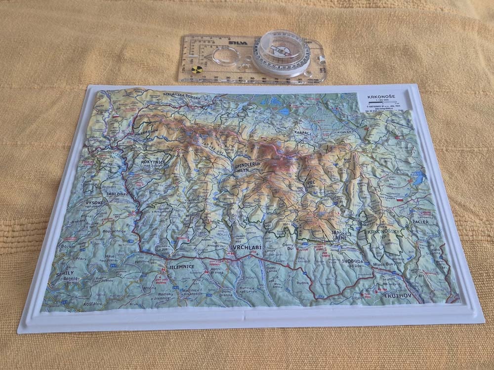 Mapa velikosti 28x20 cm zobrazuje oblast Krkonoš a blízkého okolí, vše ve stavu roku 2025.